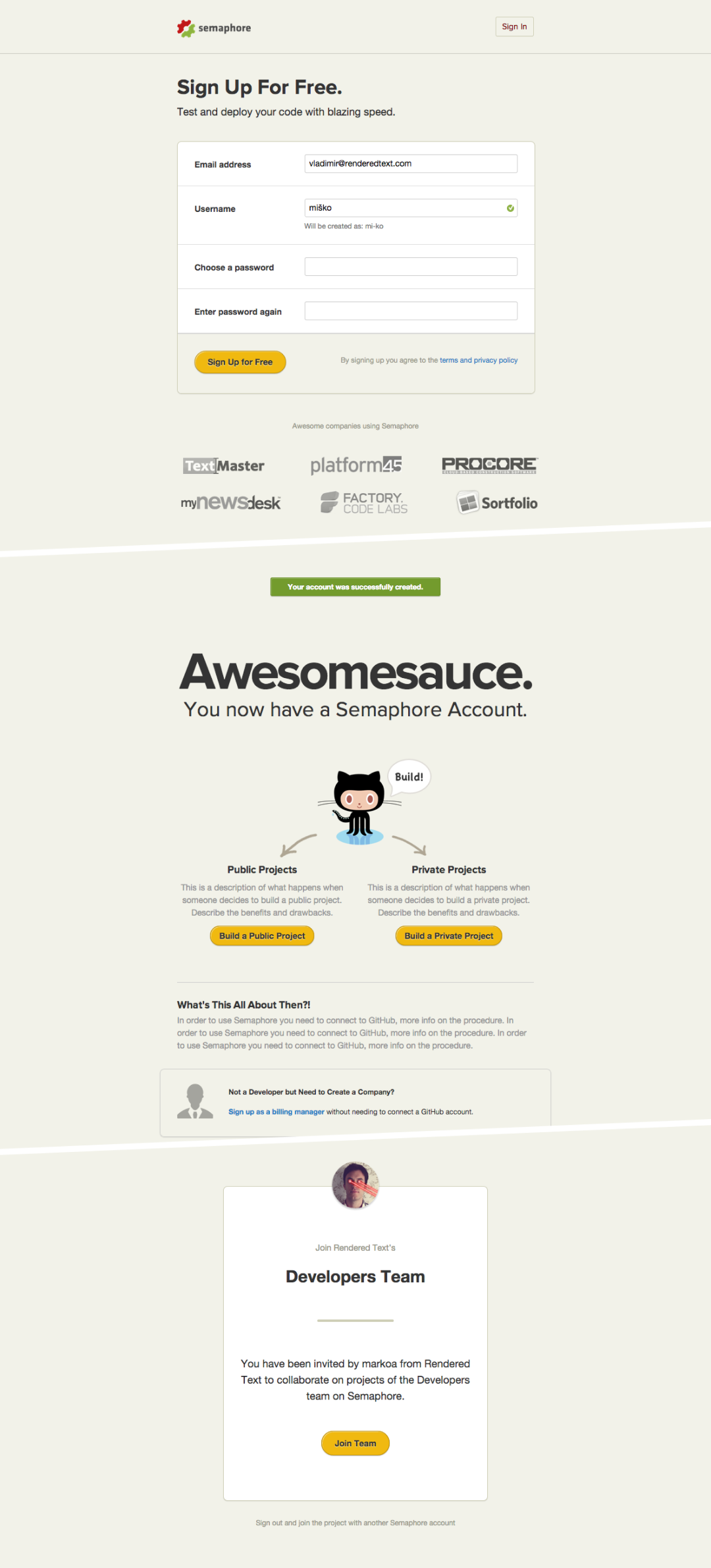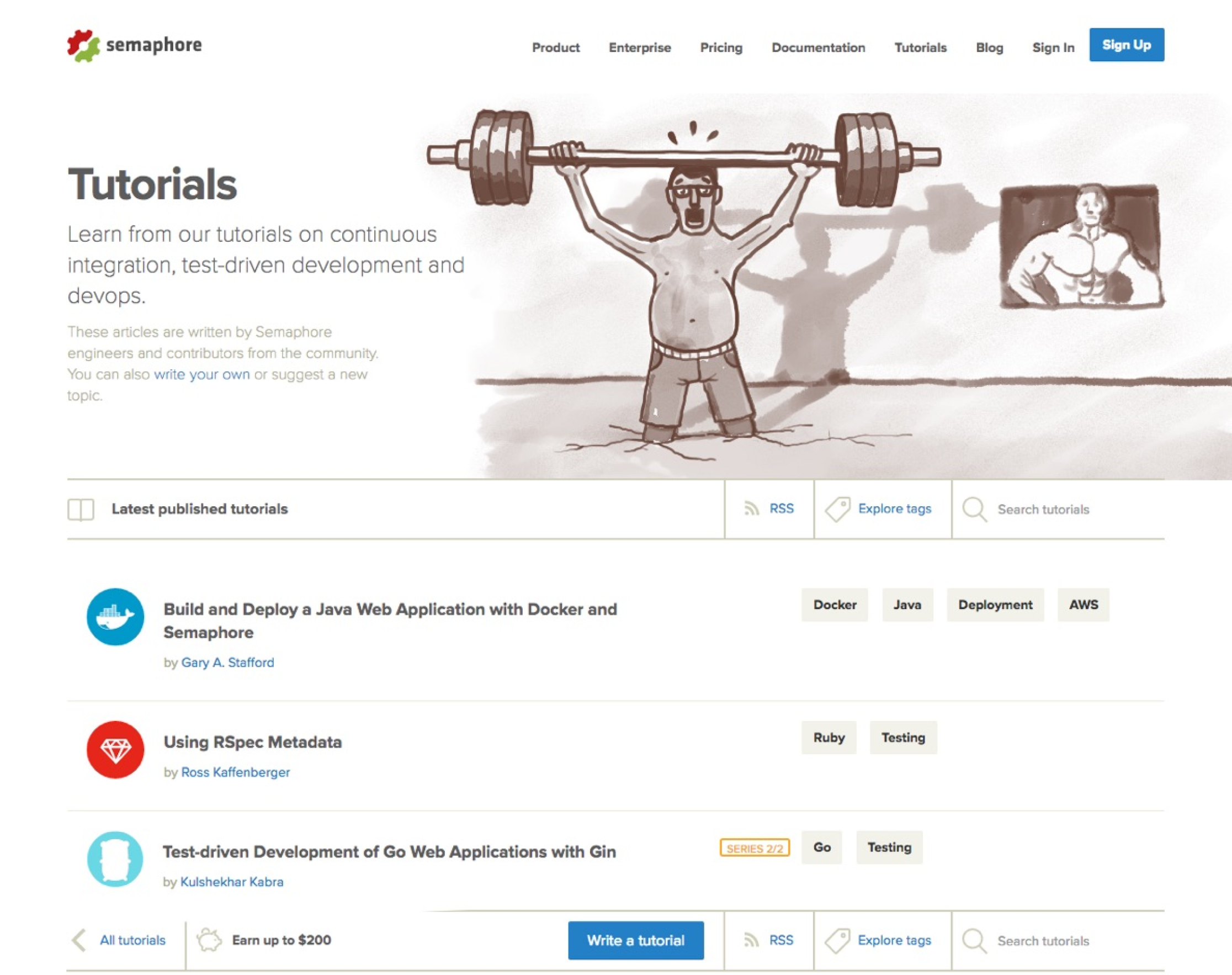 As the last part of our engagement on Semaphore, we worked on the design and front-end development of their community section. It was a community-powered tutorials minisite, where the Semaphore team — and more importantly, everyone else — could could publish helpful articles on how to use Semaphore in various environments and scenarios, and other helpful development topics.
