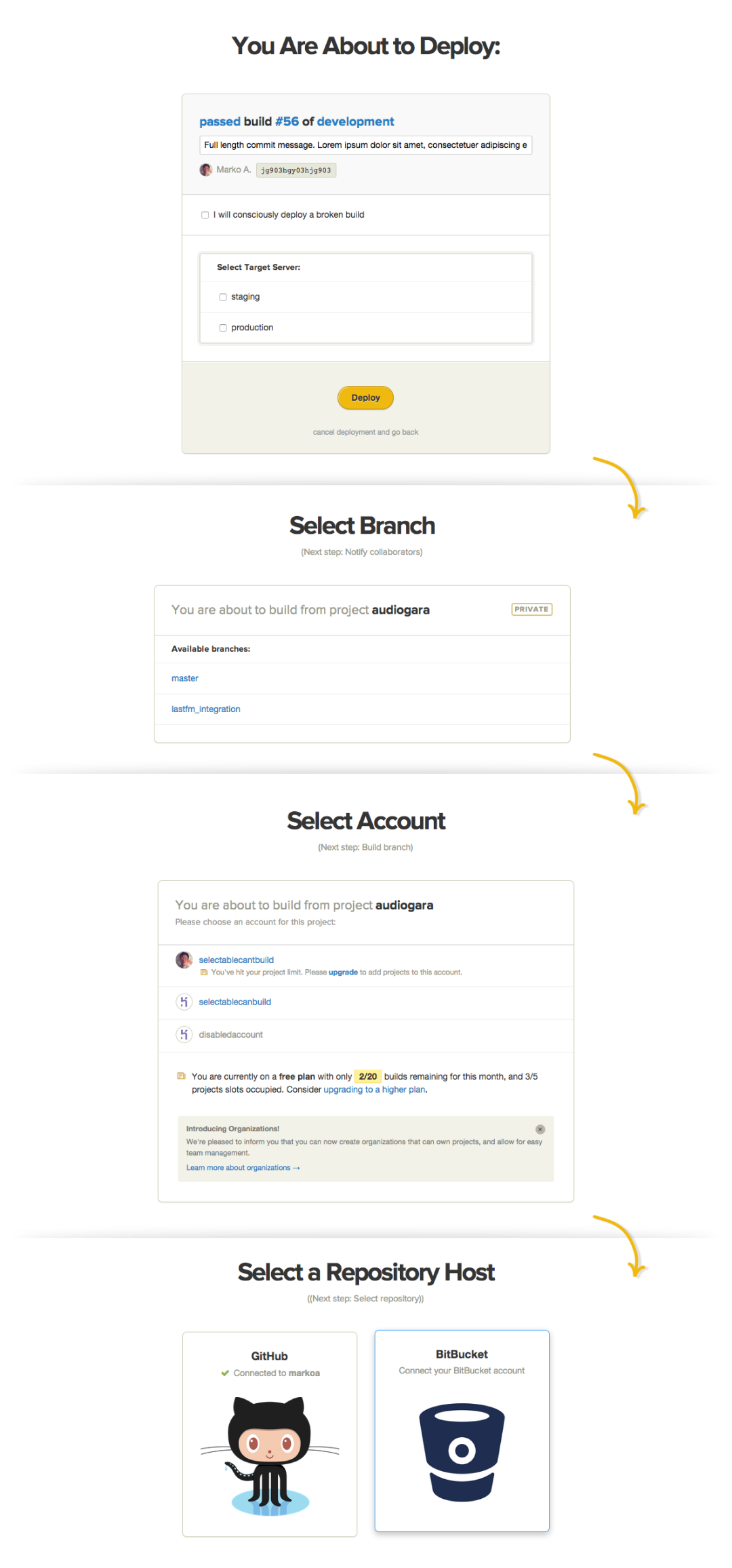 And we all know how programmers feel about their command line… Additionally, we asked the question of how could we onboard the user through a third-party service account (at the time GitHub and BitBucket) in the most straight-forward way possible.
